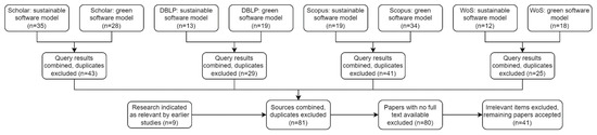 The complete flow of the study selection is presented in Figure 1. Interestingly, for all sources but Google Scholar, the query for green software models resulted in more results than did the query for sustainable software models.