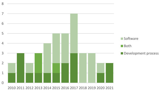 In total, software product models seem to be more popular than those of the development process—as the former were found in 61% of the identified publications, and the latter in 46% (note the sum is over 100% due to three papers belonging to both categories). The interest in software product models achieved a high plateau in years 2014–2019, whereas the interest in software development process models had one-year spikes in 2011, 2013, and 2017. On the other hand, there were no publications on software development process models in 2018 and 2019.