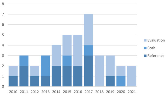 In total, evaluation models (63%) were found to be more often described than reference models were (51%; note the sum is over 100% due to six papers belonging to both categories). The interest in the reference models visibly declined after 2017, whereas the interest in evaluation models rose in 2014 and has remained relatively constant since then.