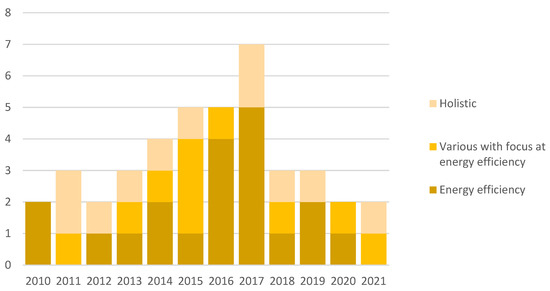 Software sustainability can be defined in various dimensions, such as environmental, technical, social, individual, and economic [54]. In an attempt to answer RQ3, we analyzed the identified models and found out that the papers can be categorized into two groups: those addressing environmental sustainability, in almost all cases pursuing the goal of energy efficiency ([17,18,19,21,22,23,32,33,34,35,36,37,38,39,40,41,42,43,44,46,47,48,49,50,51,52,54,55]), and those taking a holistic approach, addressing sustainability in its various aspects ([7,16,20,22,23,24,25,26,27,28,29,30,31,32,33,44,45,47,52,53,54]). Note that ten items ([22,23,26,29,32,33,44,47,52,54]) were included in both groups as these models consider more than one sustainability dimension but treat the topic of energy efficiency with special attention, unlike the remaining models of the second group. Figure 4 presents the number of publications from each of these categories published in respective years.