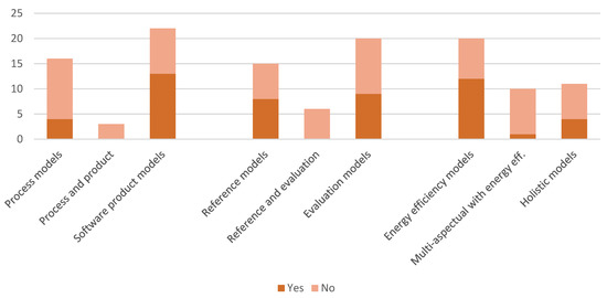 The adequateness and usefulness of models can be confirmed by their validation or verification. Answering RQ4, among the analyzed papers, there is a clean distinction between the models pertaining to software product and those pertaining to software development process (see Section 3.1): whereas the models of the first group are relatively often verified experimentally (59% of the models [34,35,36,38,39,41,42,43,46,48,49,50,52]), none of the latter were (including those covering both scopes); however, four of the models from the second group (21%) were validated, typically by performing a survey among experts or users acquainted with the model ([24,25,27,28]). While such a difference does not occur between reference and evaluation models, it can be observed between models limited to energy efficiency (of which 60% were verified or validated), holistic models (36% verified or validated), and models that consider more than one sustainability dimension but treat the topic of energy efficiency with special attention (10% verified or validated). Figure 5 visualizes these findings.