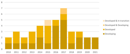 In order to address RQ5, we use the classification of countries defined in United Nations’ World Economic Situation Prospects [56]. We assign a paper to a respective country group if all its authors are affiliated with an institution located in a country belonging to that group. Two of the papers were written by authors from countries belonging to different groups; 51% of the remaining ones can be attributed to developing countries, and 49% to developed ones. There is only one paper co-authored by researchers from a country in transition. As shown in Figure 6, the shares of contribution of developing and developed countries keep fluctuating, with the exemption of the last two years, when only contributions from authors from developing countries were identified.