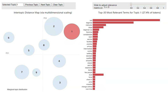After repeatedly testing the differentiation of the different number of topic classification results and filtering out meaningless words, for instance, the number of ski resort names in UGC data is very frequently, such as Wanlong, Thaiwoo, etc., to avoid the impact of such words on the probability of other words, the names of seven ski resorts are included in the stop words list. For evaluating the LDA, Blei et al. [47] proposed to use confusion degree (perplexity value) as the criterion. Through the evaluation of the resulting theme and the degree of confusion, the model parameter model is modified. At the same time, the research calls the PyLDAvis package to visualize the distance between each topic. While constantly debugging the number of topics, observing the perplexity value, and clustering visualization results under different topics, it is found that when k = 9, the topic differentiation is obvious. Therefore, it is determined that the optimal number of topics K of the LDA model in this study is 9, and the topic distance diagram and feature words are shown in Figure 2. The original feature words are in Chinese, which are generated automatically according to the original Chinese text data. To increase the readability of the Figure, we replace the feature words with corresponding English explanations.