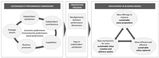 Different configurations of business models can be derived from social, organizational and technological innovations [28,41], generating impact on companies’ offerings and/or business processes towards improved corporate sustainability performance [8]. In this sense, business plans for SBM’s need to go beyond providing a positive financial business case [11] and need to consider various factors for its success, such as unified organizational vision, a visible on-board leadership, a multi-stakeholder perspective, focus on innovation and communication capabilities to deliver the core message and strategy implementation [42].