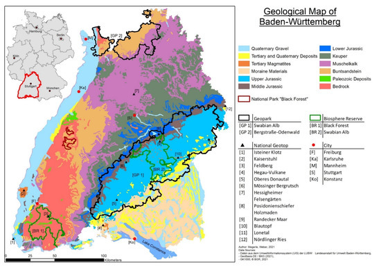 Baden-Württemberg offers outstanding geodiversity. On a relatively small area of 280 km by 210 km, nearly one billion years of earth history unfolds (see Figure 1) [23,24,25,26].