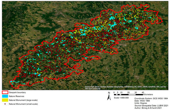 - Megerle, H.; Pietsch, D. Consequences of overlapping territories between large scale protection areas and Geoparks in Germany: Opportunities and risks for geoheritage and geotourism. Ann. Géographie 2017, 717, 598–624. [Google Scholar] [CrossRef]