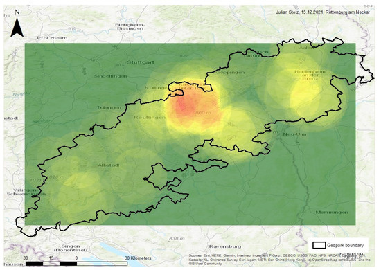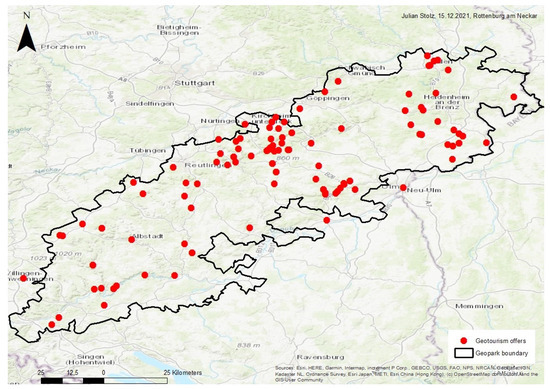 Geotourism has developed very dynamically since the nomination of the two geoparks almost twenty years ago. A complete overview of today’s geotourism offers within Baden-Württemberg is no longer possible, due to the significant increase of tourism offers. Furthermore, the clear distinction of geotourism from related forms of tourism is generally difficult [39]. For these reasons, among others, there are no new editions of the geotourism maps [76,77] to date.