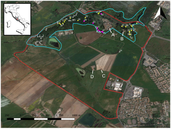 Map, from Google Earth, of the borders of the Estate (the red line) and of the study site (the SAC “Antica Lavinium”, blue line); the numbered vegetation plots (yellow dots: samplings with pure L. nobilis formations; pink dots: samplings with mixed forests of L. nobilis and C. australis; grey dots: other samplings), and the buildings: the Pratica di Mare castle (A); the Civic Archaeological Museum of Lavinium (B); Aeneas’ heròon (C); and the “Thirteen Ares” Sanctuary (D).