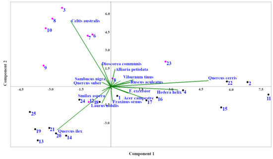 Principal Component Analysis (PCA) of the laurel forest formations of the Antica Lavinium SAC. (Numbers corresponds to the relevès of Table 1). Sampling plots with co-dominance of L. nobilis and C. australis are represented by pink dots, while black dots represent plots where C. australis was not found and L. nobilis is associated with different forest species. Weighted presence of the species within the samplings is represented by green lines, for which some of the most ecologically significant species are reported.