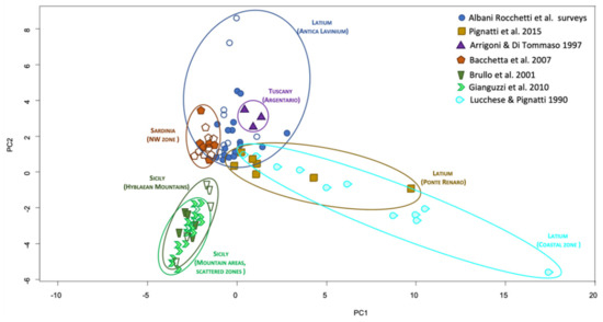 - Bartolucci, F.; Peruzzi, L.; Galasso, G.; Albano, A.; Alessandrini, A.; Ardenghi, N.M.G.; Astuti, G.; Bacchetta, G.; Ballelli, S.; Banfi, E.; et al. An updated checklist of the vascular flora native to Italy. Plant Biosyst. 2018, 152, 179–303. [Google Scholar] [CrossRef]