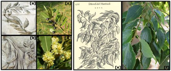 (a,b) Laurel in the Roman iconography, from the carved external front of the Ara Pacis, Rome [40]; (c,d) Details of Laurus nobilis plants; (e) “Lotus” drawing (ancient name for Celtis australis) [45]; (f) Details of C. australis leaves and fruits.