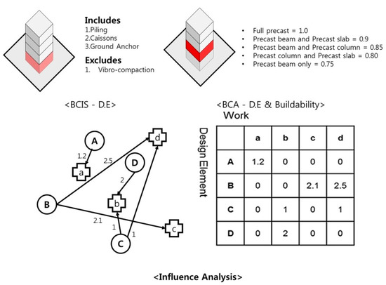 Thirdly, the Weighted Risk Structure Matrix (WRSM) has been studied and adapted in this study [15]. This method can easily express the relationship between a number of design elements and the quantities of work items. Although WRSM clearly indicates the relationship between stakeholders and risk items, it was modified in this study to indicate the relationship between design elements and work items. Figure 1 shows the concept of the WRSM. The matrix score indicates the magnitude of the influence between each design element and the construction work item. For example, design element “A” is related to the type of work “a”, and the magnitude of the association between them is “1.2”.