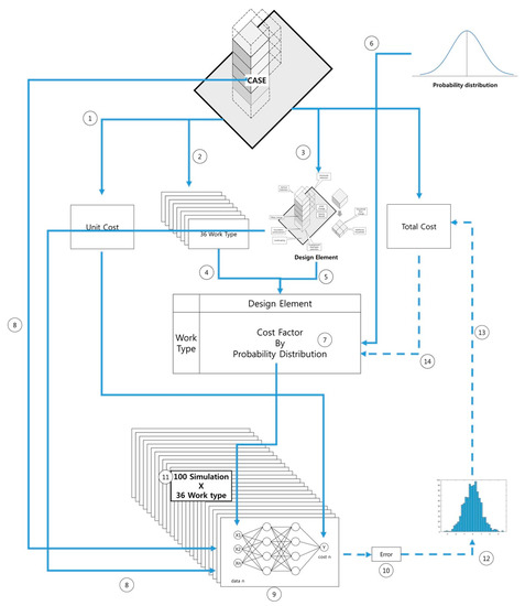 In step ⑧, a DL process is executed in conjunction with a Monte Carlo simulation. In this process, the bot project and design information are input. Using the pre-determined data from the previous matrix and the unit cost, a single DL input–output table is obtained. Step ⑨ shows the simulation operation using the DL approach. The Python program was adopted to execute the DL operation. Step ⑩ integrates the construction cost for each type of work calculated through the procedure up to step ⑨. By adding the 36 work types, the error for each simulation is obtained. Step ⑪ shows a 100-iterative simulation process using Monte Carlo simulation, and it creates 100-DL output. In this step, random simulated data are obtained from the probability distribution generated in step ⑦. All these DL output data are gathered to compute an error value for comparison with the real construction cost for each work item.
