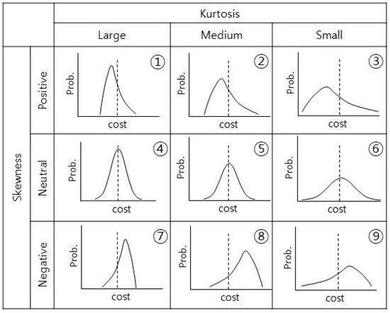 There are three major types of construction cost: the type with no variation from the median value (types 3, 5, and 8), the type with slight variation (types 3, 6, and 9), and the type with large variation (types 1, 4, and 7). Nine probability types of design elements–work items were classified. Each probability distribution was used in this study.