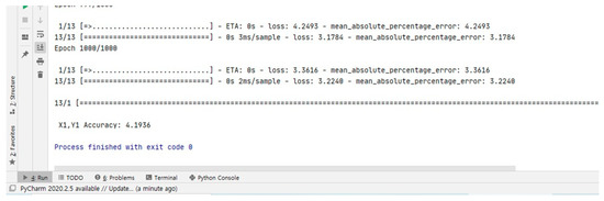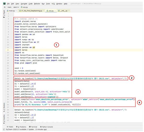 Python®, Tensorflow®, and Keras® were used to perform DL. A screenshot of the DL programming, Phycharm®, is depicted in Figure 5. The coding process was divided into four parts. As shown in Figure 5, part ① uploads the essential processing tools before executing the DL program. They are Numpy®, a tool for processing raw data, Pandas® for loading rows and columns in the database, and Chardet® for loading the CSV file format. In part ②, DL can be executed by entering the path where the CVS file exists. In part ③, the positions of input(x) and output(y) in the database are designated, and the use of the Sequential Neural Network is allocated. Next, the number of layers is specified. The function used in the layer is a mixture of a rectified linear unit (ReLU) and sigmoid. In part ④, the method used to calculate and display the value is entered. The Mean Absolute Percentage Error (MAPE) is employed as the system error value. It has been designed to study 1000 times, and although it takes a long time, each case is entered so that a more accurate value can be calculated.