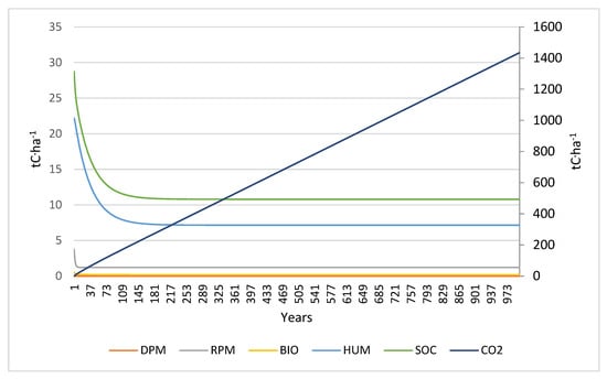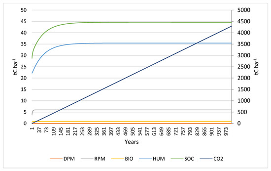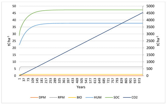 Scenario 4 (Figure 4) has a similar trend to Scenario 2. The addition of organic fertilizer is reflected in a slight increase in carbon pools and SOC compared to Scenario 2. Soil organic carbon takes longer to reach stable values (47 t C ha−1 after 907 years); this might be partly due to the humic component (HUM) directly supplied to the soil via organic fertilizer, which has a much longer turnover time than DPM and RPM.