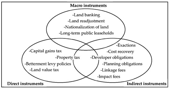 Direct instruments are public value capture instruments that are solely based on the motivating rationale that unearned land value increments should be redistributed to the community [6,18,37], or in other words, to the public. This is typically accomplished by some form of taxation. Indirect instruments, on the other hand, do not hinge on linking specific value increments to public action in the same way as they build on a variety of other motivating rationales [6,37]. While there might be an element of capturing unearned increments, this can be much less explicit in the case of indirect instruments and may even be concealed by other motivating rationales brought to the fore as the primary objectives [5,18,37]. Examples of other motivating rationales include cost recovery, a need for resources to provide public services and the internalization of costs to mitigate impacts and negative externalities [6,18,37]. The use of indirect instruments in some empirical contexts might be difficult to connect directly to capturing unearned private land value gains, and may instead be capturing value increments caused by the landowners. For this reason, some have suggested that public value capture should more broadly refer to any instrument that captures any increase in land and building value, and not solely unearned land value increments [6,7], a perspective adopted here as well. As a result of being more pragmatic, flexible and adaptable in practice, indirect instruments are more common than direct instruments. However, both direct and indirect public value capture instruments are sometimes prescribed within the same projects [37].