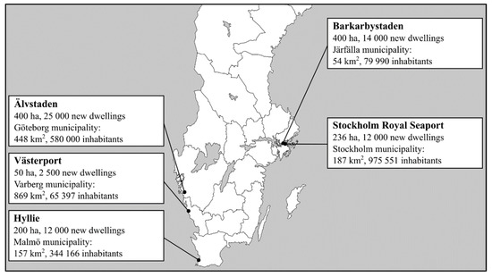 For the study, five ongoing sustainability-profiled district developments were selected from different Swedish municipalities. Although they are becoming more common, there is still a very limited number of such ongoing district developments in Sweden. Therefore, in order to “maximize the utility of information” from a limited number of cases, the districts were chosen based on expectations of the information that could be gathered from them, which Flyvbjerg [71] (p. 230) refers to as information-oriented selection. They were mainly selected based on the municipalities’ very high ambitions on sustainable development and innovation and the considerable use of sustainability criteria in municipal land allocations and requirements in development agreements. Stake [75] advocates for the study of extreme and unusual cases, such as these, because they can reveal things that have previously been overlooked in typical cases. According to Flyvbjerg [71] (p. 13), extreme cases also “activate more actors and more basic mechanisms” and thereby generate more information.