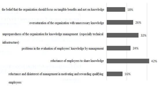 Surveys show the following barriers to the implementation of knowledge management. The research was focused on the use of knowledge management in selected companies in Slovakia. The research aimed to find out the degree of awareness in organizations about the use of knowledge, how they use it, and what their benefits for increasing competitiveness are. The research was carried out on a sample of selected organizations from various sectors (telecommunications services, postal services, logistics and forwarding services, industrial organizations, construction and agricultural enterprises, public administration institutions, universities, organizations in the field of financial and insurance activities, and wholesale and retail Figure 3 [38].