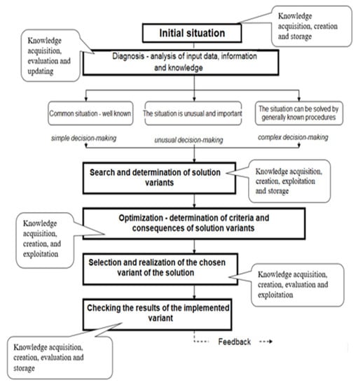 In [7], the authors also confirmed the importance of knowledge. They argued that, given the growing competitive environment, recognizing the strategic value of knowledge as an important resource for maintaining a competitive advantage and improving organizational performance. The relationship between modern management and knowledge management is explained in the literature as follows: Organizational development in response to change is part of the transition from an industrial society to a knowledge-based society whose economic basis is the creation and exchange of intangible goods and services. The people of the knowledge society are the main players in the knowledge society who can create and use new knowledge effectively, intentionally, and continuously. The response to these requirements is the emergence of a new discipline—knowledge management, which seeks to develop a systematic way of identifying, acquiring, maintaining, and using intellectual capital [8]. Conscious knowledge management can significantly improve the organization’s work and, thus, its overall performance. Knowledge is stored in people’s minds, not in information systems. If we want to work with knowledge, we must work with people. Knowledge: Knowledge = information + x, x = previous knowledge, skills and experience, mental models, relationships, the values and principles according to which we live, and what we believe in. Knowledge is related to human activity and emotions. Knowledge management is a deliberate activity designed to ensure that people have the right knowledge at the right time. In [9], the authors also confirmed this idea. They claimed that the basic goal of knowledge management is the appropriate shaping of knowledge resources in the organization and ensuring its smooth flow in the individual functional areas of the enterprise. Organizations that know how to manage knowledge and manage it consciously achieve success in a short time. The rationale for knowledge management functionality needs to be emphasized as an added value in achieving sustainable development. This requirement is based on the UN Commission’s definition: sustainable development is development that meets the needs of current generations without compromising the needs of future generations and without doing so at the expense of other nations. In Slovakia, sustainability requirements are taken into account on the basis of the National Strategy for Sustainable Development. It is an extensive strategy focused on cultural, social, environmental, and institutional conditions, each of which requires the implementation of knowledge and, thus, functional knowledge management. There is no need to spend a lot of money on knowledge management; Knowledge management is not based on IT systems, such as data and information management. It is based on conscious work with the bearers and owners of knowledge—people [10]. In [11], the author concluded that these words bring us a new paradigm—the only advantage in competition will be people who have the knowledge and the ability to use it effectively in practice. This is the basis for knowledge management—a trend in management that brings social change. The importance of knowledge management lies in the effort to understand the theoretical level and to help in the practical creation of the social and technical conditions that will help and motivate the acquisition, capture, sharing, and use of knowledge in the organization [12]. Good knowledge is the basis for good decision-making. In [13], the authors argued that the on-demand availability of consolidated information is a critical success factor to performing decision-making activities. Similarly, in [14], the authors stated that knowledge management and decision-making strategies are crucial factors for organizations. In the context of decision-making and the decision-making process, some important facts need to be emphasized. The decision-making process always arises when there are several solutions for the output, but at least two alternatives. Managers at all levels in the company face many challenges in carrying out their profession, which require them to take a stand and decide. These problems are related, not only to the internal environment of the companies where managers work, but also to the turbulent external environment. Decision-making is linked to the great variability of relevant changes. In [15], the authors declared that, firstly, the large number of decision-makers and their diverse backgrounds may lead to uncertainty and/or inconsistency and, so, it makes it difficult to assess the quality of the information provided, as well as to merge this information. Secondly, they declared that it is desirable, or even indispensable, depending on the situation, to obtain a solution accepted by most of the decision-makers, or at least to assess the existing level of agreement. Decision-making is one of the most important management activities performed in companies. Decision-making is an essential and irreplaceable part of management. The quality of management depends on the quality of its decision-making. Management decision-making is a special type of decision-making. Its importance in the company is manifested mainly in the fact that its quality and the results of these processes, especially the strategic decision-making processes, have a fundamental impact on the efficiency and future prosperity of the company [16]. Decision-making analysis generally assumes that the decision-maker faces problems in deciding, where the decision-maker has to choose one of a number of options. In principle, the decision-maker must have at least some knowledge of the phenomenon; otherwise, he will not be able to make reasonable and justifiable decisions [17,18,19,20]. Decision-making can be defined as the process of identifying and selecting alternatives/variants based on the values and preferences of the decision-maker. We can now see how decisio