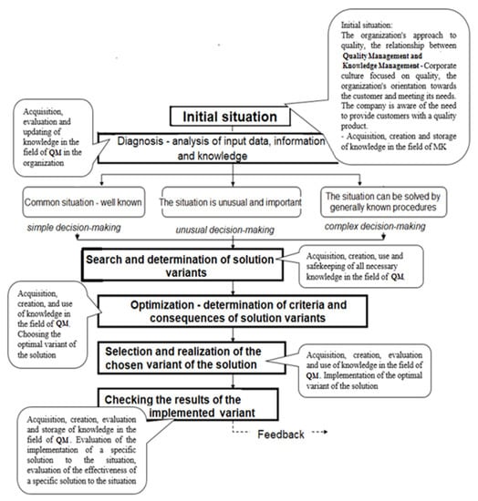 The environment in which managers currently operate is dynamic and turbulent. This fact affects the great complexity and dynamism of changes. Thus, decision-making becomes more complex in the context of sustainability. Decisive decision-making is becoming rare, and the challenge of globalization is increasing. Under its influence, decision-making is no longer deterministic. Decision-making processes prevail in conditions of uncertainty. In this context, there is a very intense need to be acquainted with progressive tools to support decision-making and management and to apply the acquired knowledge in practice. This paper focuses on three related areas. We are talking about knowledge management in connection with the most important contributing element—decision-making with quality management. We deal with the characteristics of the individual areas, defining their mutual relationship on a systemic basis. The paper also points to the necessary connection between theory and practice. More specifically, it points to the practical applications of management to decision-making as a managerial function and, at the same time, related to decision-making in quality management. Subsequently, we define the links to knowledge management with an emphasis on the use of procedures, methods, and knowledge in the decision-making process, which we use in theory and practice in quality management.