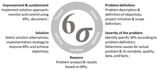 One of the key concepts related to quality management is Six Sigma. The Six Sigma methodology focuses on process standardization and variability reduction, in accordance with the Lean thinking approach, aiming at reducing various wastes. Six Sigma projects follow a practical roadmap called DMAIC, which is the classical cyclical process of five stages known as Define, Measure, Analyze, Improve, and Control []. These logical steps are used to identify and solve several kinds of problem and are reinforced through the tools offered by Industry 4.0.