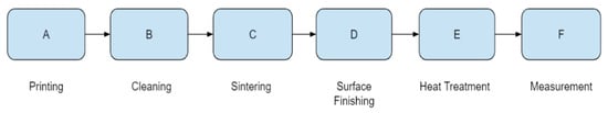For this study, we focus on a Binder Jetting (BJ) process relying on metal raw material as a reference. BJ is commonly used for the AM of fully functional parts with powdered materials as input. BJ is a 3D printing process that uses a liquid binding agent deposited onto a build platform to bond layers of powder material and form a part []. This technology can be used to print a variety of materials including metals, polymers, and ceramics. Common applications and markets for this process and its products include industrial applications of dental and medical devices, aerospace components, part casting, and luxury applications [].