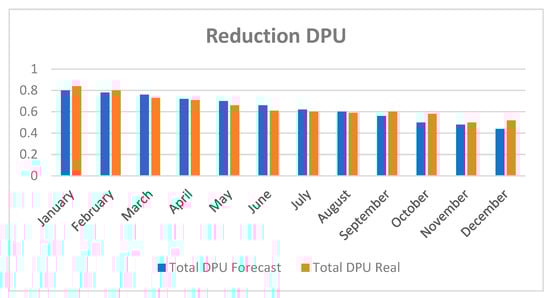 Reduction in total DPU of the process. Process DPUs represent the defects that are observed during the manufacture of the product, defects created during the process in addition to those originating from the purchased parts, and that are detected before the product reaches the customers. In AM, the reduction of defects on each stage is observed through all the steps mentioned in the analysis phase. Controlling the reduction of DPU in each stage leads generally to meaningful reduction of the quantity of defective final products. For a given process, total DPUs represents accumulated DPUs throughout the process steps. Measures are taken every month. Furthermore, it is important to establish targets DPU values and compare each month with the real ones. An example is presented in Figure 5.