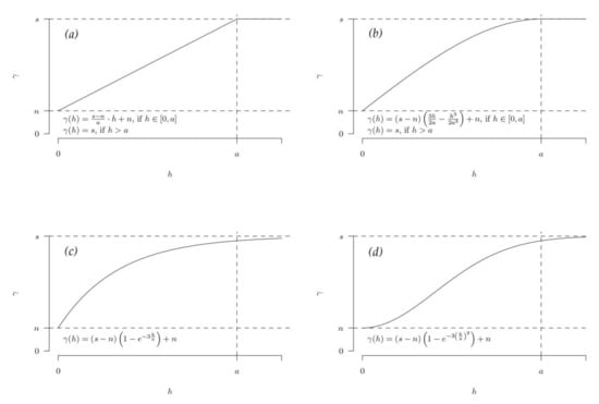 The variogram is an essential geostatistical tool that expresses the spatial correlation between sample values. Mathematically, it is defined as the average of the squares of differences between pairs of samples, separated by a distance h [25]. The spatial continuity is reflected in the growth rate of the variance following the distance from the sample [26]. The kriging method usually uses four types of variograms, as shown in Figure 1: (1) linear; (2) spherical; (3) exponential; and (4) Gaussian [27].