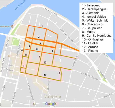 The busiest areas in the center of Valdivia stand out for the dimensional inequality of the concrete slabs and their distribution. In addition, there is a difference in materials between the concrete slabs, generating pavements with different ages. There is no coherence among the observed repairs, given that they do not resemble each other in form, i.e., there are circular, rectangular, and irregularly shaped patches, and they do not have the same composition, presenting different combinations of asphalt mixture and asphalt cement. Moreover, the poor quality of the joints and, in some cases, their nonexistence, on top of the climatic conditions of the city, facilitate the infiltration of water that causes the erosion of the interior layers, seeping toward the surface and leaving the slabs without support, resulting in fracturing and cracking.