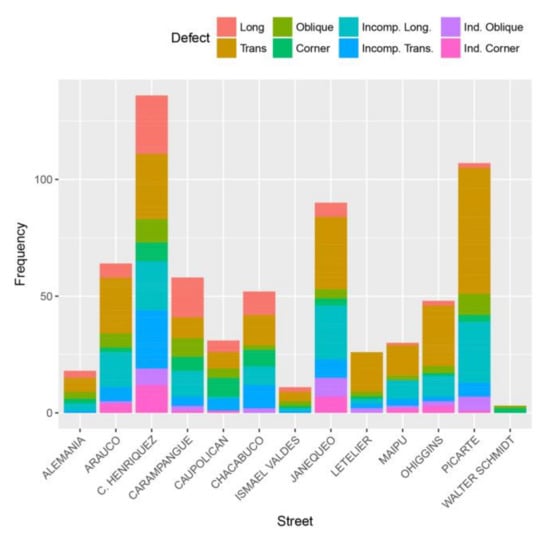 Figure 3 shows the distribution of defects per street. The streets with the most defects are Camilo Henríquez (136 in 500m, 20.18% of total defects) and Picarte (107 in 450m, 15.88% of total defects). The least compromised street was Walter Schmidt (3 defects in 251m, 0.45% of total defects). It is possible to observe that, while Camilo Henríquez street has a wide range of different defects in these streets, both Picarte and Janequeo streets have predominantly transverse and incomplete longitudinal defects. The most frequent defect type was transverse (34.42%), with incomplete longitudinal in second place (18.99%). Incomplete oblique and incomplete corner defects, the least frequent in our sample, accounted only for 4.59%, respectively. In relative terms, the streets with the highest number of defects per linear meter were Letelier (0.43) and Maipú (0.54). Only 60% of the detected defects could be cataloged using the Visual Inspection Instructions [29], which points to the necessary updating of this instrument.
