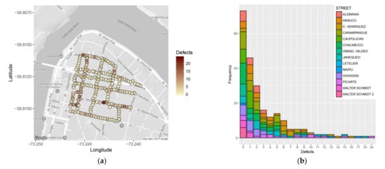 Failure distribution mapping in Valdivia (Chile): (a) Geolocated frequency of defects for the slabs sample; (b) distribution of the defects found in each street.