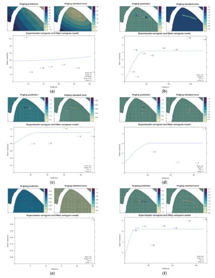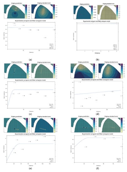 Ordinary Kriging for the city of Valdivia: (a) Janequeo Street; (b) Carampangue Street; (c) Alemania Street; (d) Ismael Valdés Street; (e) Walter Schmidt Street; (f) Chacabuco Street.
