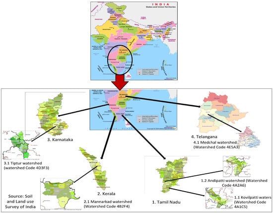 Study area in four south Indian states viz. (1) Kovilpatti watershed in Thoothukudi district and Andipatti watershed in Theni district of Tamil Nadu, India; (2) Mannarkad watershed in Palakkad district of Kerala, India; (3) Tiptur watershed in Tumkur district of Karnataka, India; and (4) Medchal watershed in Medchal−Malkajgiri district of Telangana state, India.