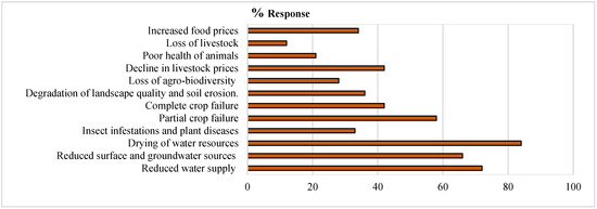 Among various climate change impacts, drought is the major issue faced by farmers, as it affects their livelihoods in semi-arid regions of Southern Indian watersheds (Figure 2). The farmers responded that they have received less and uneven rainfall, reduced intensity of rainfall or no rainfall in the monsoon seasons, which has affected their agricultural and allied livelihood activities over the last 30 years [18]. They also responded to perception-based responses about drought impacts viz. drying of water resources (84%), reduced water supply (72%), reduced surface and groundwater sources (66%), partial crop failures (58%), decline in livestock prices (42%), complete crop failure (42%), degradation of landscape quality and soil erosion (36%), increased food prices (34%), insect infestations and plant diseases (33%), loss of agro-biodiversity (28%), poor health of animals (21%) and loss of livestock (12%), respectively (Figure 2). These results also coincide with the findings of Udmale et al. [18]. The farmers also perceived that the deforestation, encroachment of water bodies, discouragement of cultivation of less water consuming crops (millets/pulses/oilseeds), encouragement of cultivation of high water-consuming crops (vegetables/rice/sugarcane), mismanagement of water resources, and increased bore wells as the major reasons for the severity of the drought in the region. The results coincide with the findings of Muralikrishnan et al. [19]. Moreover, in recent past, irrigated agriculture had a positive and important impact on aggregate agricultural and other allied sectors production. Hence, the current drought situation in the semi-arid pastoral and agricultural watershed areas requires effective adaptation and mitigation strategies for sustainable agricultural production under prevailing climate change and weather variability. Further, the development of alternative livelihood systems may support in coping-up the changing climate to transform the agricultural production systems and sub-sectoral diversification of agricultural production and off-farm activities of processing and marketing support to maximize the agricultural livelihoods and economic development of the region [20].