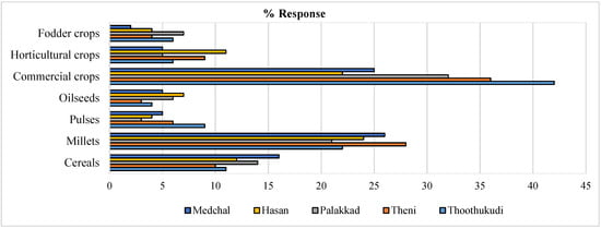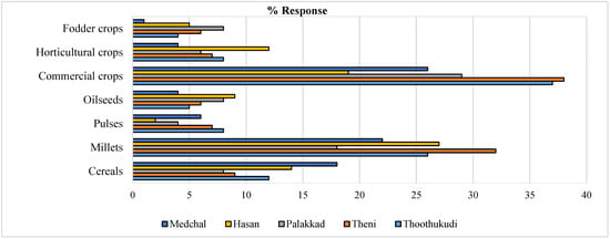 The farmers (n = 400) reported substantial reduction in cropped area among major crop categories of cereals, millets, pulses, oilseeds, commercial crops, horticultural and fodder crops. The average cropped area reduction indicated that the commercial crops such as cotton (26%), millets viz. pearl millet, finger millet and other millets (22%), and sorghum (18%); have shown reduction in acreage due to changed cropping patterns. Millet acreage showed reduction due to reduced millet-based consumption patterns in the semi-arid regions. The other crops’ area viz. pulses (6%), oilseeds (4%), horticultural crops (4%) and fodder crops (1%) reduced minimally (Figure 3), due to the lowest drought impacts on these crops [6]. The climate change impacts viz. reduced rainfall, continuous dry spells, severity of the droughts in various selected districts’ agro-ecologies, considerably reduced the cropped area under various crops in the region (Figure 3). Such results were also observed by Raza et al. [21].