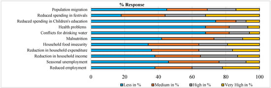 Drought-impacted semi-arid regions of Southern India have faced multiple climatic and non-climatic risks [23]. A maximum numbers of households were engaged in the pastoral- and agricultural-based rural social settlements and fewer households were engaged in industrial and service sectors for their livelihoods. Hence, the drought impacted their livelihoods and the farmers, relatively, had poor socio-economic status. The farmers reported that the deteriorated socio-economic status led to reduced spending on children’s education (74%), health problems (68%), conflicts for drinking water (68%), seasonal unemployment (46%), population migration (45%), malnutrition (42%), reduction in household income (38%), reduced employment (38%), reduction in household expenditure (36%), household food insecurity (34%), and reduced spending in festivals (18%) to very high socio-economic impacts, reduced spending in festivals (32%), reduced employment (22%), household food insecurity (19%), reduced household expenditure (16%), population migration (14%), reduction in household income (13%) and malnutrition (10%), respectively (Figure 5).