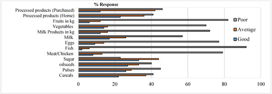 The drought-led socio-economic impacts affected the household food and balanced-nutrition diet of semi-arid regions of South Indian watersheds (Figure 6). In general, the drought affected the (i) food availability due to reduced agricultural production, (ii) food access due to poor affordability of food, and (iii) accessibility of quality food grains utilization with food safety and standards [6,24]. The farmers reported that the daily food consumption was affected severely, as compared to recommended (WHO) healthy dietary practices [25]. The cereals (41%), pulses (45%), oilseeds (40%), milk (57%) are in the daily routine of the households’ food habits. Further, the households consume processed products (46%) and vegetables (70%) on a weekly basis; fruits (82%), eggs (77%) on a fortnight basis; and non-vegetarian diets (79%) and fish (92%) on a quarterly or half-yearly basis. Hence, the consumption of food items such as fish, fruits, non-vegetarian items like meat and chicken, processed products, vegetables and eggs, was poor among the households (Figure 6). It is all due to reduction in local food systems and increased food prices [26]. Less food accessibility also led to poor food consumption pattern, thus, leading to reduced food intake and nutrition insecurity due to less per capita food consumption [3,26]. Most of the households relied upon purchased cereals, vegetables, fruits, and animal source foods in the drought affected semi-arid regions of south Indian watersheds. However, it was observed that the public sector social programs such as the public food distribution system, rural employment programs, mid-day meal schemes for school children, and integrated child development schemes collectively supported the rural masses to reduce the nutrition insecurity issues in the region [26]. Hence, the drought impacts affected the physical, socio-economic and food consumption status which can be linked to environmental, behavioral and developmental economics principles of the developing nations [6,11,26]. Moreover, behavioral studies provide more realistic models of human behavior to recognize the present issues to make decisions in challenging situations. Hence, studying the farmers’ behavior is an effective tool to make use of appropriate adaptation and various mitigation strategies for climate resilience while improving public policy, programs and processes [27].