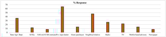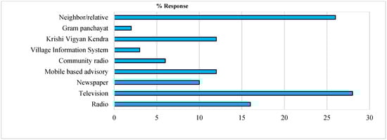The farmers’ usage of weather information plays a very important role in drought adaptation, mitigation and effective management of agricultural activities through increased public awareness so as to understand the drought situations and encourage them to get involved in reducing the drought risks [6,27]. The electronic and print media bridge the gap between the farmers and weather forecasting stations to access timely and relevant information in short-term, medium-term and long-term crop calendar preparations so as to reduce the drought risks [3]. Most of the farmers access the production led agro-advisories from the input dealers followed by innovative farmers, media sources and public sector agro-advisories. With respect to the weather information, most of the farmers follow their ancestors’ indigenous technical knowledge for their pastoral and agricultural activities, particularly, the time of sowing and harvesting operations. So, the respondent farmers placed less importance to the weather information-based agro-advisories. The farmers reported that they usually accessed weather information through television (28%), followed by neighbors or relatives (26%), radio (16%), mobile-based agro-advisory (12%), public sector agricultural science centers (Krishi Vigyan Kendras (KVKs)) (12%), community radio (3%), village information system (3%) and gram-panchayats (2%), respectively (Figure 7). It shows that the farmers had poor access to weather information for their agricultural activities. To improve the existing conditions, the public sectors and other development stakeholders in the agricultural sectors must be given high priority for timely delivery of the weather-based information support to the farmers [3]. The drought mitigation and adaptation through weather-based crop insurance schemes and other alternate climate-resilient varieties and the recommended climate-smart agronomic practices also need urgent attention [3,28]. Hence, improvement in weather information usage through promotion of weather-based agro-advisories and climate smart agricultural practices through awareness/training program can support effective adaptation and mitigation practices in semi-arid regions [24].