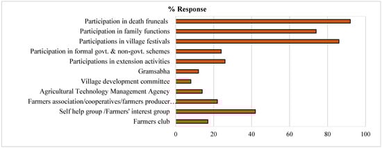 The social participation level of farmers plays a very important role in climate-smart agricultural technologies adaptation and mitigation measures [29]. The rural community has better social cohesion, which enhances the peoples’ participation level in the community development processes in a sustainable manner [26]. It can reduce the social and economic impacts of droughts in the semi-arid watersheds of South India. It can support local communities to build self-reliance and preparedness to manage drought consequences [23]. In the current study, the farmers participation level was mainly in death funerals (92%), village festivals (86%) and family functions (74%), with less social participation level in the formal socio-economic activities such as engagement in self-help group (SHG), participation in extension activities (26%) and other government and non-government schemes (24%), farmers’ cooperatives and farmers’ producer companies (22%), farmers’ clubs (17%), agricultural technology management agency (ATMA) activities (14%), gram-sabha (12%), village development committees (8%), etc. (Figure 8). The intensive agro-advisories and awareness/training programs may improve the peoples’ participation level in drought adaptation and mitigation activities in the semi-arid watersheds of Southern India. The respondents’ effective social participation level may create better social, knowledge and extension networks among the farmers’ social settings and it may also enhance the awareness and knowledge level for better climate adaptation and mitigation strategies.