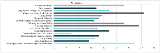 The farmers reported a reduction in average crop production of all the major crop categories of cereals, millets, pulses, oilseeds, commercial crops, horticultural and fodder crops. The average crop production reduction was highest in commercial crops such as cotton (29%) followed by millets, such as pearl millet, finger millet and other millets (26%), cereals such as sorghum (16%), all due to the reduced cropped area and drought related production impacts [6]. The pulses (5%), oilseeds (5%), horticultural crops (5%) and fodder crops (2%), registered the least reduction in average crop production due to least reduction in the cropped area and the lowest drought impacts (Figure 4). Major reasons for the reduction in production and productivity in the drought-affected semi-arid region are the early-season and mid-season droughts that cause more production losses [6]. Moreover, such crops as cotton and millets, and particularly sorghum, incur more production expenditures on farm labor for intercultural operations. Moreover, the market for these commodities vis-à-vis their demand from the consumption point of view is entirely different from the regularly consumed cereals, such as rice and wheat. Hence, the farmers showed the least interest to go in for their high yielding varieties and costly intercultural operations. Further, the respondents responded that due to the drought impacts, the arable land was kept fallow, which encouraged the long-term forest plantations [11]. Moreover, the Indian semi-arid regions require improved drought monitoring and early warning systems, particularly for agricultural drought assessment as an integrated agro-climatological drought mitigation measure. For example, in the semi-arid Marathwada region of India, the satellite and model-based input parameters were analyzed at a monthly scale from 2001 to 2018 which depicted moderate to extreme drought cases in the years 2002, 2009 and 2015–2016, with significant increase in drought intensities and drought frequency over the years 2001–2018. Similarly, the Chennai meteorological station in Tamil Nadu also reported from the data of the last 30 years (1989–2019) that the warmer days and dryness in weather increased and the rainy days reduced in the semi-arid regions of Tamil Nadu, India [22].