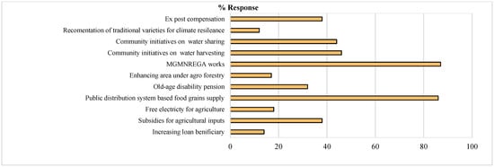 Drought mitigation practices are the holistic approaches or techniques or applied means to reduce the risks of economic, social, and environmental drought impacts for attaining ecosystem sustainability in the period of the drought-related aridity [3,4,28]. In current study, it was observed that the social security programs amply supported the drought mitigation practices such as public sector’s rural employment program (Mahatma Gandhi National Rural Employment Guarantee Act (MGNREGA)’ program works (87%), public distribution system based food grains’ supply (86%), community initiatives on water harvesting (46%), community initiatives on water sharing (44%), subsidies for agricultural inputs (38%), ex-post compensation (38%), old-age disability pension (32%), free electricity for agriculture (18%), enhancing area under agro-forestry (17%), increasing loan beneficiaries (14%) and recommendation of traditional varieties for climate-resilience (12%), respectively (Figure 11). This study revealed that most of the frontline economic upliftment-based appropriate mitigation measures have not reached or were ineffective for more than half of the respondents in the semi-arid watersheds of Southern India. Hence, there is an urgent need to promote and develop more extension centric social development and skill upgradation related strategies for improved mitigation practices in the semi-arid watersheds of Southern India. Effective drought preparedness and mitigation can effectively reduce the impacts of droughts through accurate weather prediction, monitoring the drought situation and assessment of impacts [6]. The technological drought mitigation strategies such as the satellite based geographical information system (GIS)-based information can also play a very important role in the early warning systems, drought monitoring and impact assessment purposes [6,11]. Likewise, effective soil and water conservation, and herd management practices can act as good drought mitigation practices in drylands [7,11,12,35].