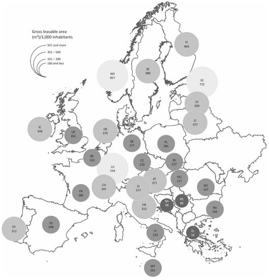 The development of shopping centers in the Czech Republic and Slovakia needs to be understood in a broader space-related context. Shopping centers are among the preferred shopping options in the whole of Europe. This fact is proved by the density of shopping centers based on the size of their gross leasable area (m2) per 1000 inhabitants of a country (Figure 2), which reaches above-average values in many post-communist countries (Slovenia, Croatia, Latvia, Lithuania, Estonia). Vice-versa, the values in some countries are below the average (Romania, Bulgaria, Serbia, and so forth), where a mass development of shopping center construction can be expected in the future []. In any case, these are values that should be taken into account for whole countries. The values of large, metropolitan cities and the rest of the country may vary. While the development of shopping centers was delayed in Eastern Europe (mainly after 1995, or as the case may be, after 2000) compared to Western Europe, the current state shows rapid adaptation of consumers to this shopping format, in which case, their development, in terms of the retail life cycle, has not reached the maturity phase, yet.