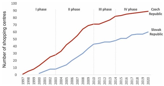During 30 years of the contemporary development of retail, 89 shopping centers have emerged in the Czech Republic and 60 shopping centers in Slovakia. The development of shopping centers in the Czech Republic and Slovakia may be divided into four phases. The first initial phase relates to the opening of the first shopping centers till 2003. The first shopping center in the Czech Republic was opened in 1997, and three years later in Slovakia (Figure 3). The first phase of shopping center construction developed more intensively in the Czech Republic, where 31.5% of all shopping centers were established by 2003. In Slovakia, the development of shopping center construction was less dynamic; 13.3% of the existing shopping centers were opened by 2003 (comparatively, shopping centers in the Czech Republic began to develop earlier). The initial phase of shopping center development was also the first stage of opening the operation (launch/innovation) in the life cycle of shopping centers [] in both countries. This phase’s typical features include very few shopping centers operating in the given area, thus low competition. Demand for shopping centers exceeded supply in both countries.