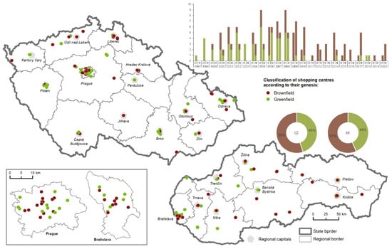 There are many suggestions for classifying shopping centers provided by various authors [,,,]. In our study, we have chosen three elementary classification criteria: (i) According to their genesis in brownfields or greenfields, (ii) according to their localization within a city, and (iii) according to their size.