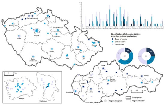 Localization of shopping centers within urban zones can also be regarded as a crucial element of a shopping center’s success [,,]. It is also why the second classification criterion was the localization of shopping centers within basic morphogenetic urban zones [,]. The analysis reveals that the localization of the shopping centers is different in both countries, and it has its own specifics. While in the Czech Republic most shopping centers are from the group of “out of center” (49%), in Slovakia the shopping centers are from the group of “out of town” (52%). Moreover, there are the fewest “out of center” shopping centers out of all shopping center categories in Slovakia; in the Czech Republic the shopping centers are often in historic city centers. Localization of shopping centers in historical urban centers is more typical in less populated cities than in capitals (Figure 5). However, both countries have a common trend already lasting the entire decade: The shift of shopping center construction out from peripheral areas (beginning of development) to the city centers (construction in brownfields). Again, it is a trend supporting revival and social-economic sustainability of the city hub and inner-city areas [,]. However, the sustainability of a city focused on shopping opportunities cannot be tied only to shopping centers and their expansion. The sustainability of cities highly depends on the city center viability and shopping street resilience []. Development of shopping centers in the historic city center or inner city can lead to a conflict between retail zones (shopping streets vs. shopping centers). In post-socialist cities shopping centers predominate over shopping streets []. Urban sustainability has been associated with preserving balanced retail systems set in diverse facilities and shopping environments that are able to respond efficiently to the needs, wants, and desires of different types of consumers. Cities with an efficient network of centers that deliver goods and services to the vicinity should be more sustainable than those without such a network [] (p. 4).