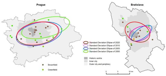 In Bratislava, the spatial expansion of shopping centers has different features. The initial phase was not analyzed since, by 2000, only two shopping centers had been established (for the SD ellipse analysis at least three shopping centers are needed). In the phase by 2005, the ellipsis has a north-east gradient, which is in line with urban development trends and sub-urbanization processes []. In the next phase (until 2010), the spatial expansion in Bratislava had similar features as in Prague. The spatial expansion lost its momentum and was concentrated more in the inner city up to the historical center []. However, the latest development of shopping centers in Bratislava is different from Prague. The emergence of new shopping centers in the western part of the city resulted in the change of spatial expansion of shopping centers in Bratislava (Figure 7).