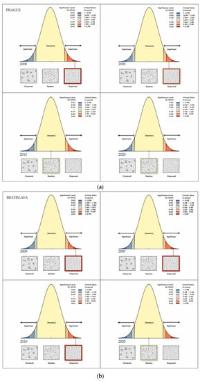 The degree of spatial agglomeration of shopping centers, measured by the average distance to the nearest neighbor, has a different development in both cities. The analyses reveal that the first two phases of development of shopping centers in Prague are characterized by dispersion distribution of shopping centers in the city. After 2005, it is a random distribution. Bratislava, unlike Prague, reached the random distribution of shopping centers as late as in the last development phase. Neither in Prague nor in Bratislava has there occurred a phase with higher level of agglomeration in the development of spatial distribution of shopping centers that would indicate a clustering distribution pattern (cf. []). The nearest neighbor indices, or R values, of Prague’s/Bratislava’s shopping centers are 2.07/204.4 in 2000, 1.29/1.74 in 2005, 1.19/1.45 in 2010, and 1.10/1.16 in 2020, respectively.