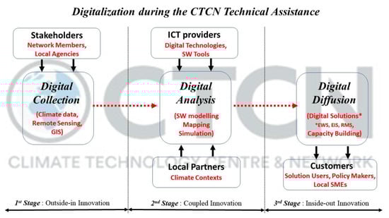 After that, we identified the major barriers to digitalization through in-depth interviews with major digital-climate stakeholders, and then, based on a staged innovation model proposed in our previous study, we clearly proposed three digitalization stages of digital collection, digital analysis, and digital diffusion within the context of outside-in, coupled, and inside-out innovation models during various CTCN D-TA activities.