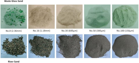 Siliceous river sand and crushed waste glass sand used in the ASR test.
